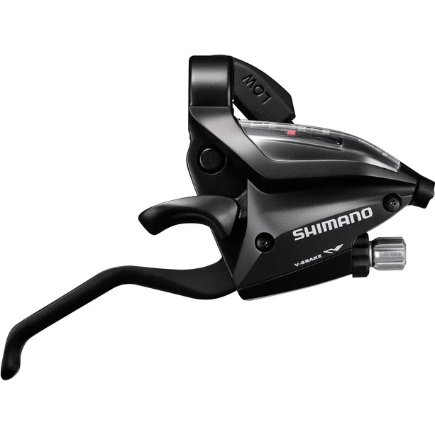 Cette unité de levier de vitesses et de freinage peu coûteuse est équipée d’un affichage des vitesses et d’un réglage intégré de la largeur de la poignée. L’unité peut être utilisée avec des freins V-brake ou des freins disque mécaniques de VTT. Le câble de frein peut être facilement ajusté à partir du guidon.
